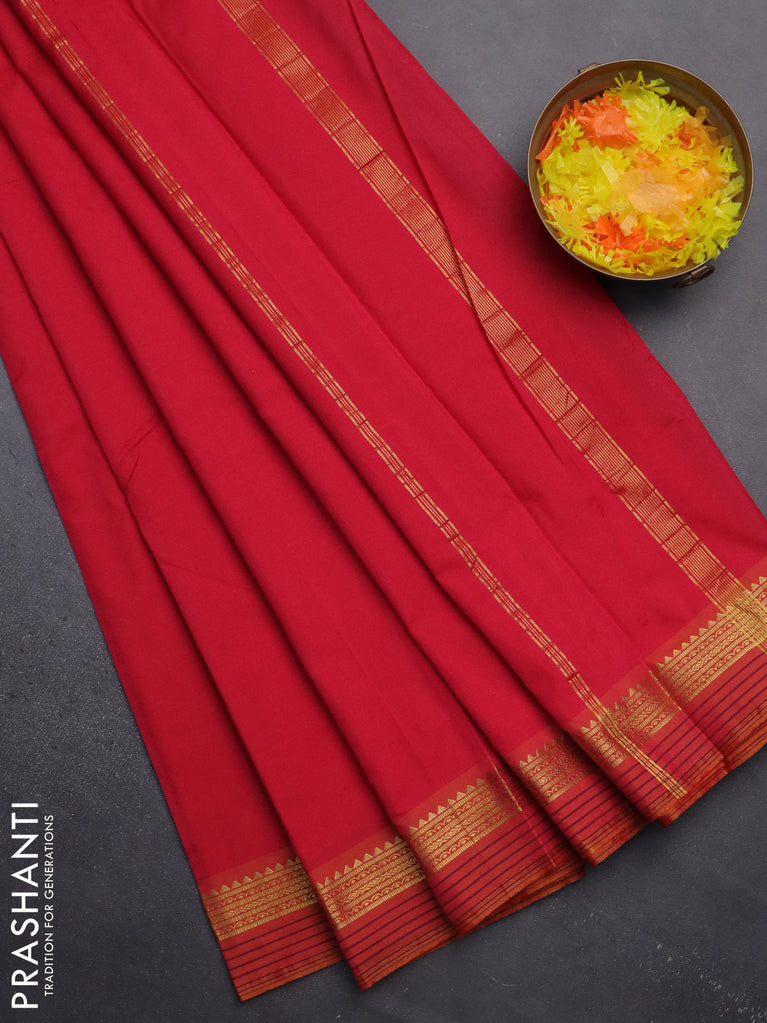 Arani semi silk saree red and light green with plain body and paisley zari woven simple border