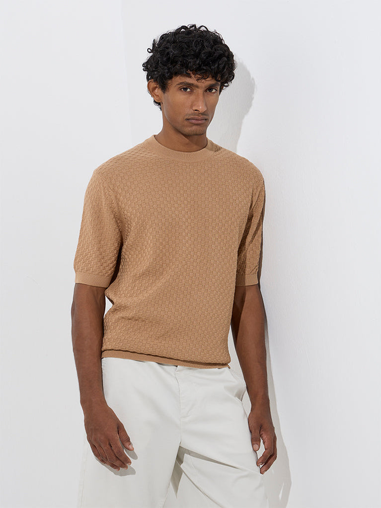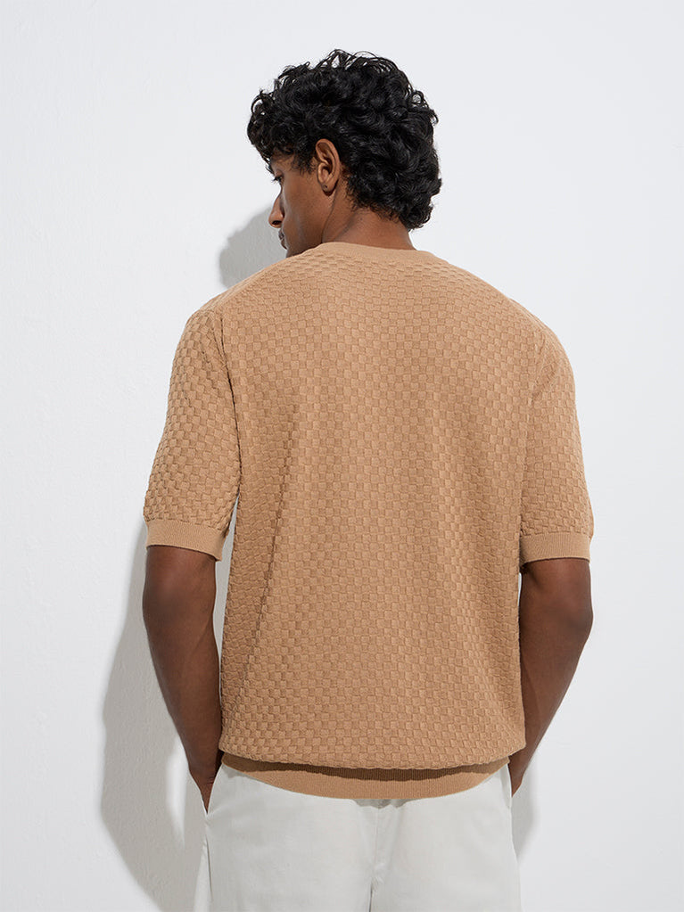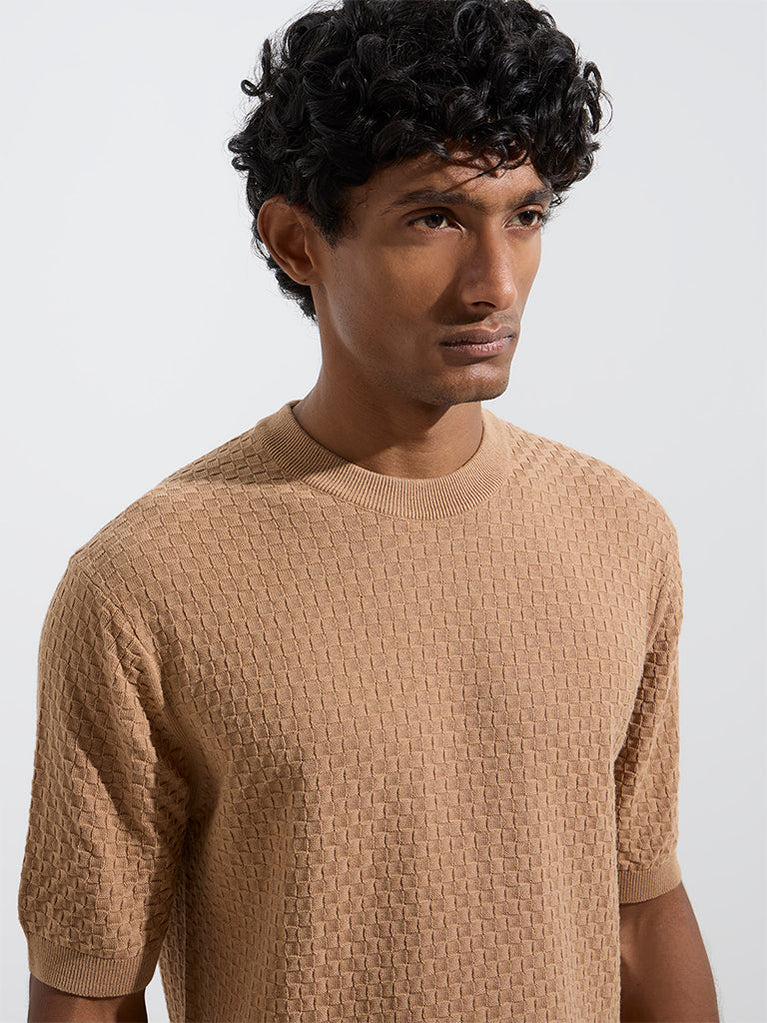 Ascot Tan Self-Striped Relaxed-Fit Cotton-Blend T-Shirt