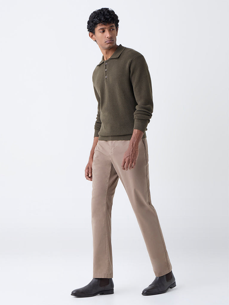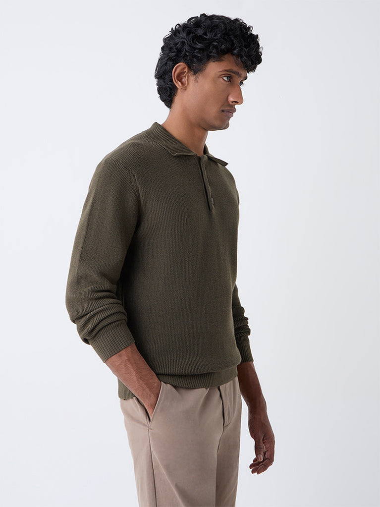 Ascot launches this olive polo sweater tailored for warmth, comfort, and easy sophistication. Made from a cotton-blend fabric and cut in a relaxed frame, it features full sleeves, a spread collar, and a quarter button placket. The refined knit texture brings a sleek, elevated finish to winter dressing.