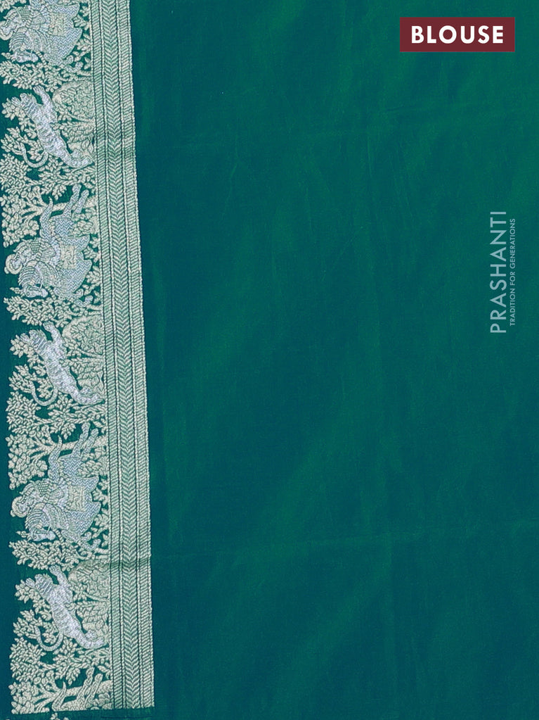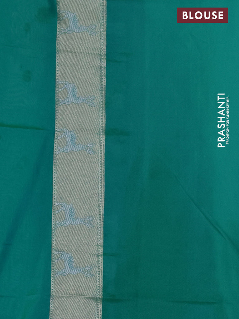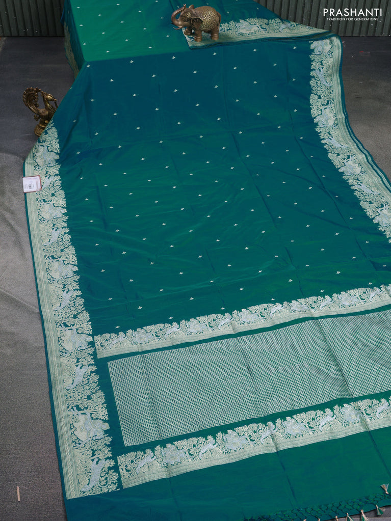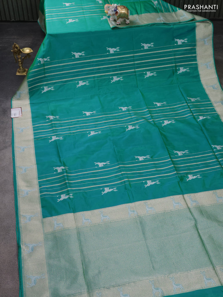 Banarasi semi katan silk saree teal green with allover silver & gold zari weaves and deer design zari woven border