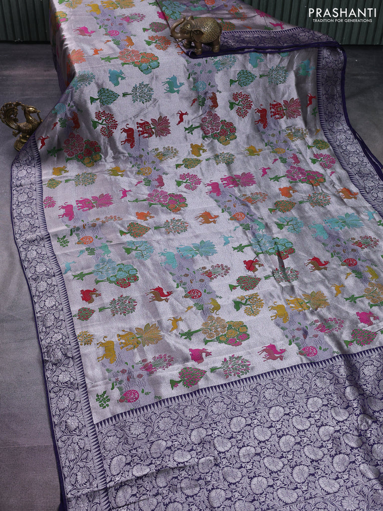 Banarasi semi raw silk saree navy blue with allover silver zari woven brocade weaves and floral design paithani border