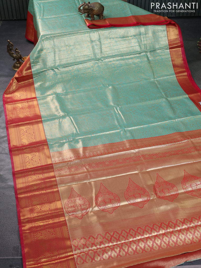 Bangalori tissue silk saree teal green and red with allover zari woven brocade weaves and long zari woven border