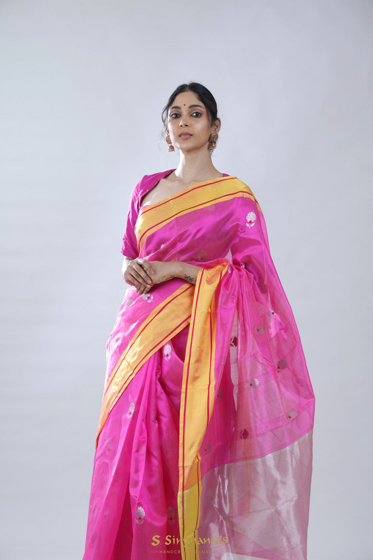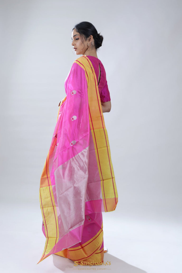 Barbie Pink Chanderi Saree with Floral Buttas