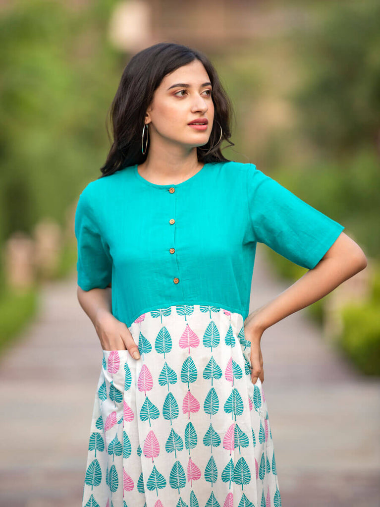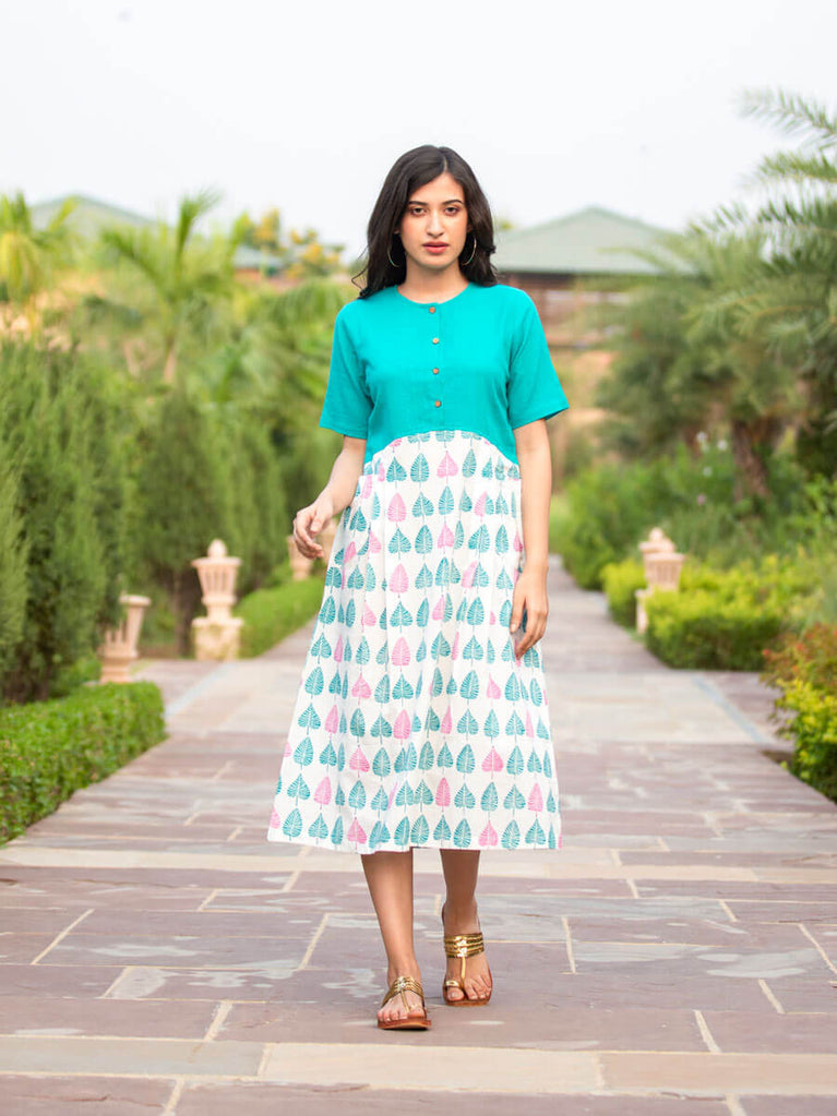 Banyan Leaf Cotton Slub Pleated Dress With Pockets