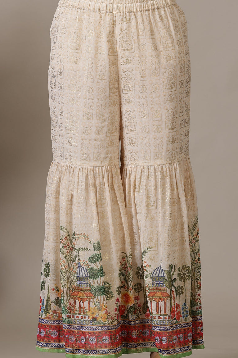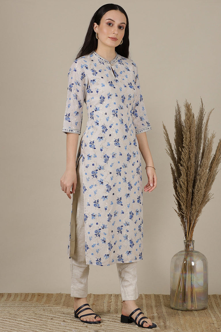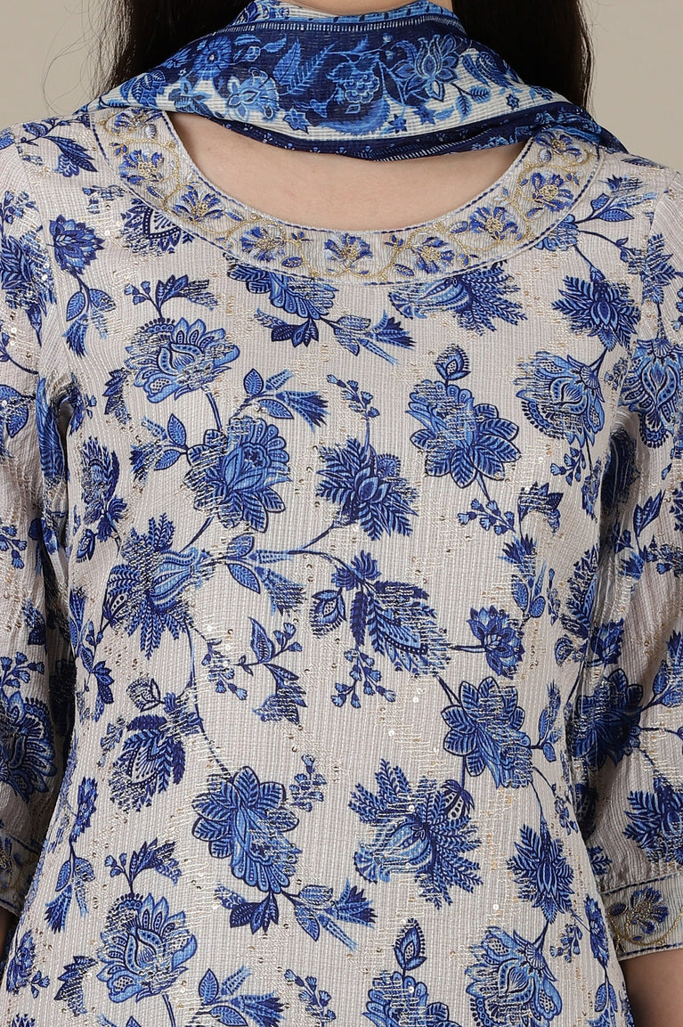 Beige Floral Printed Sequined Kota Straight Kurta, Palazzo and Dupatta Set