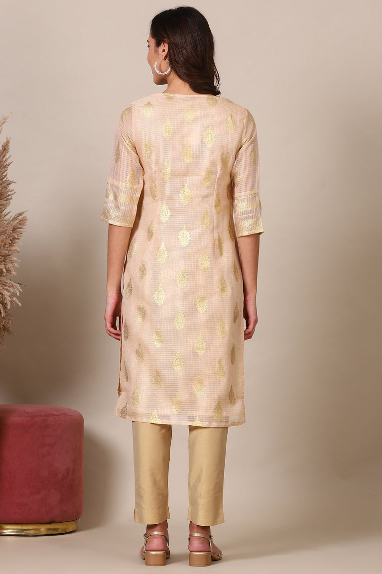 Beige Foil Printed Straight Kota Kurta with Embroidered Neck