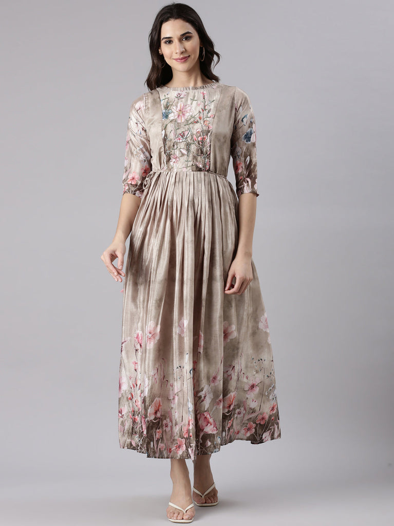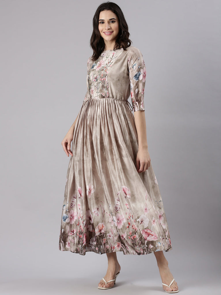 Elevate your wardrobe with this beige silk printed long frock that blends timeless elegance with modern sophistication. Crafted from smooth silk, it features delicate prints that add a graceful touch to your look. The flowing silhouette ensures comfort while flattering your figure, making it perfect for both formal occasions and refined casual outings. Experience effortless style with a piece designed to enhance your natural charm.