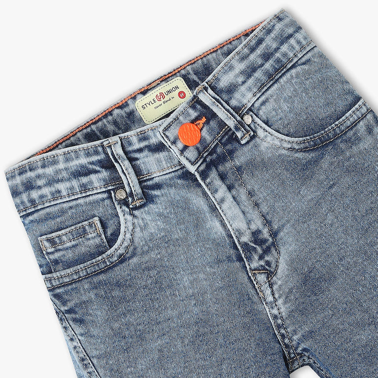Below Knee Length Stretchable Denim Shorts With Front Cut And Sew