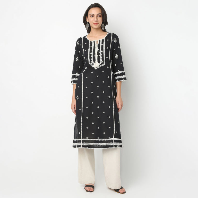 Below Knee Three-Fourth Sleeve Straight Fit Embroidered Kurta