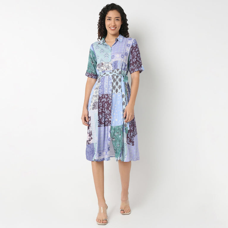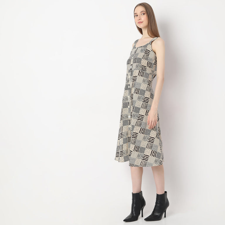 Below Knee Sleeveless Shirt Collar Schiffli Flare Fit Dress