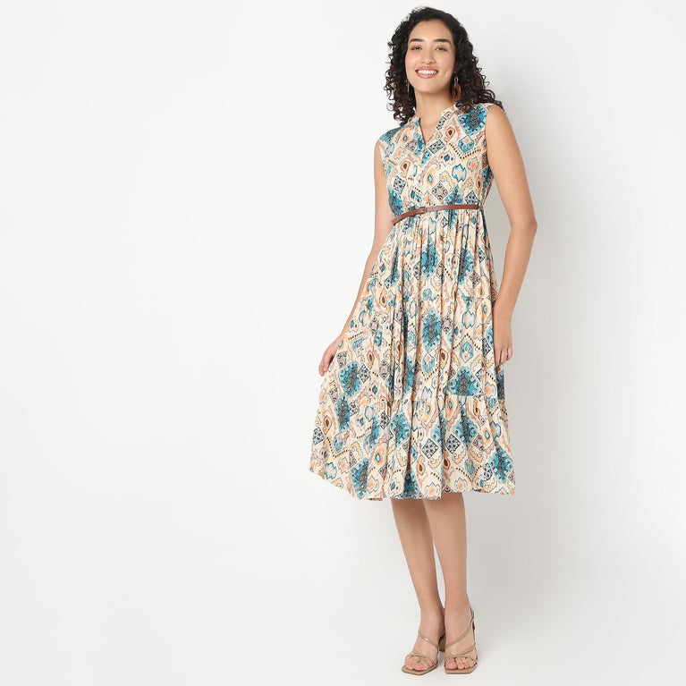 Below Knee Sleeveless Flare Fit Printed Kurta