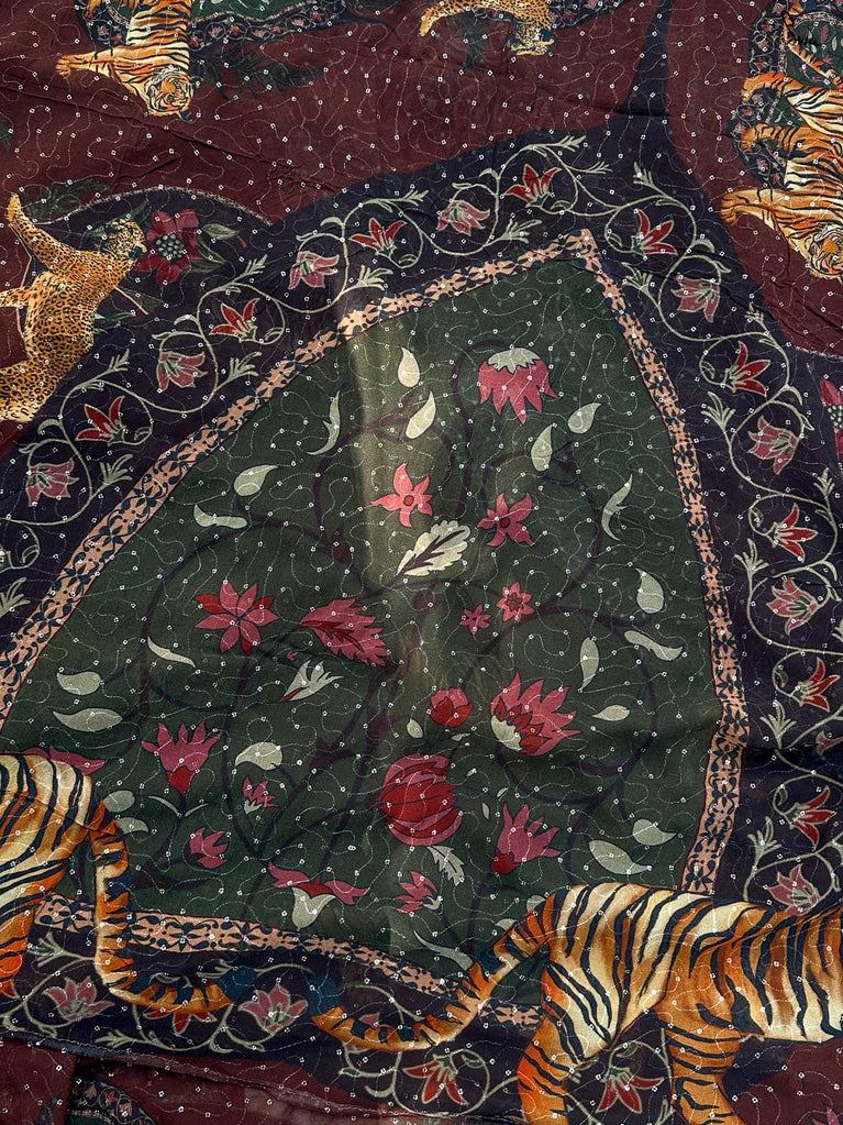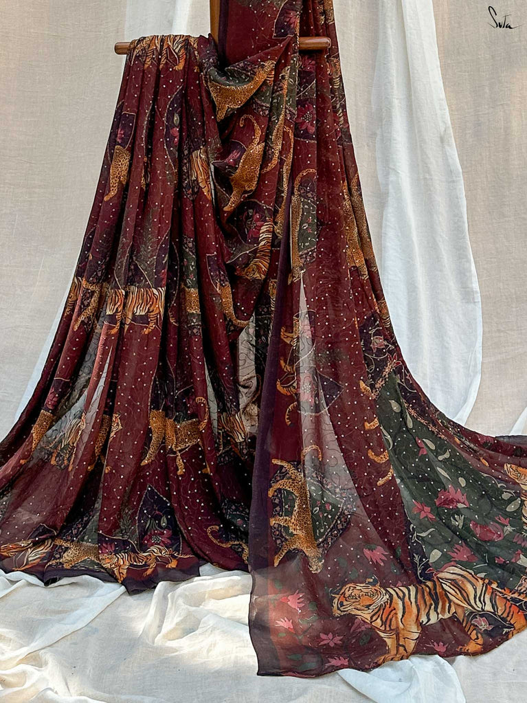 Bhagalpuri saree dark mustard and maroon with allover bandhani prints and long pichwai printed zari woven border