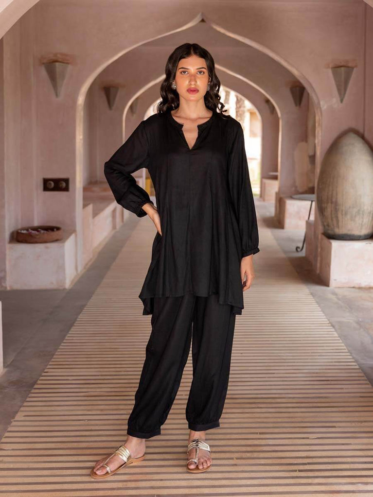 Be festive ready with this pretty black embroidered kurta set. The kurta is designed in asymmetrical silhouette and has V-neck. It is coordinated with black tights.