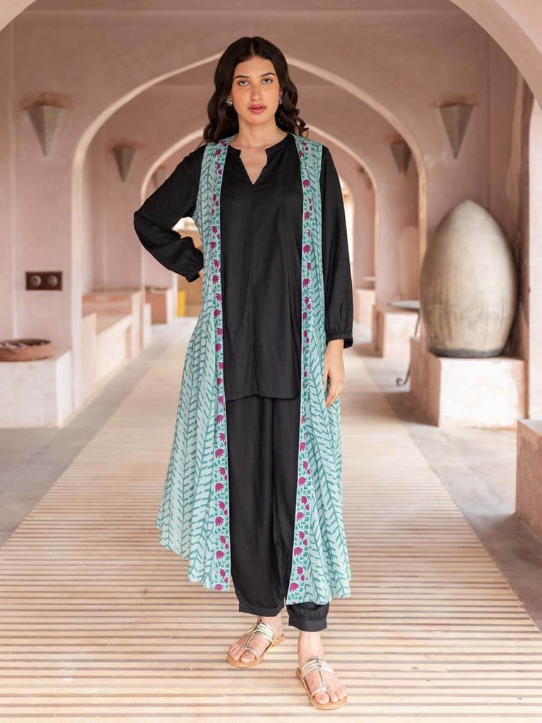A kurta set laced with elegance to make you look graceful on all occasions. It features a jet black glittered geometric print straight kurta having zari embroidered yoke with round neckline and three-quarter sleeves. Well-matched with green calf length printed flared culottes.