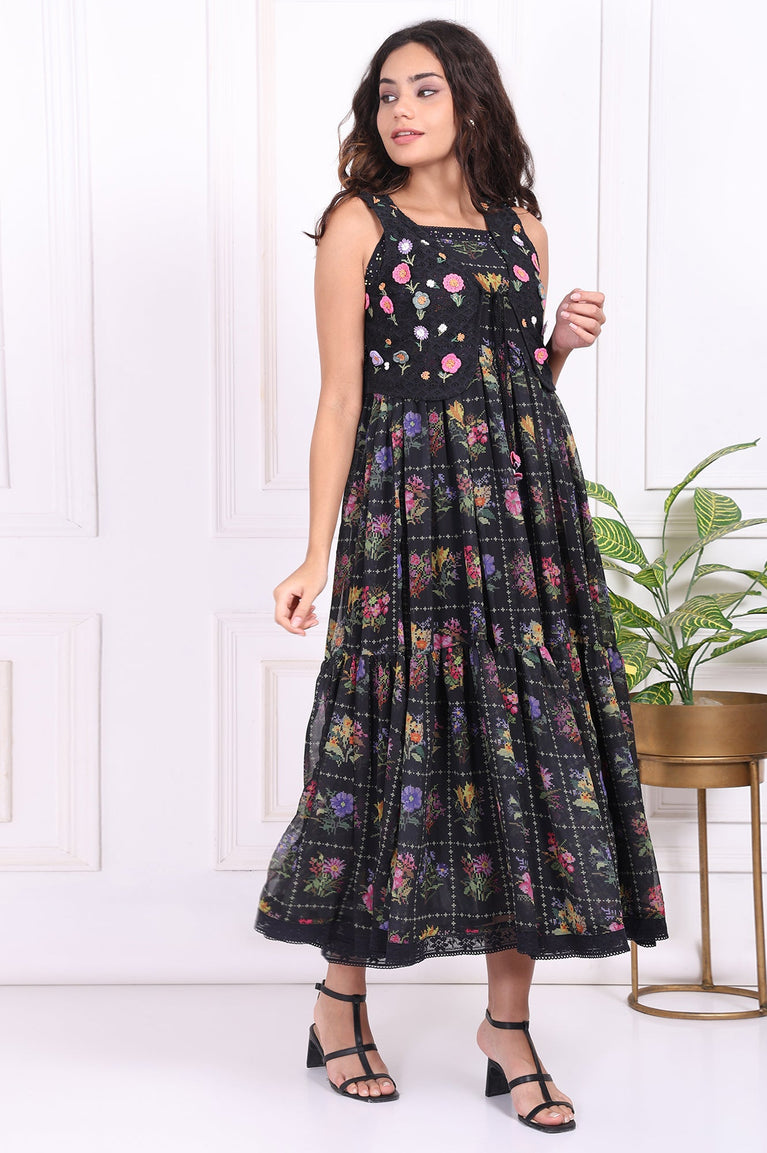 A celebration of bohemian elegance, this black floral printed dress paired with an embroidered waist coat is a wardrobe must-have. The sleeveless design and square neckline offer a modern touch, while the tiered flared hem adds a playful vibe. Perfect for casual outings or garden parties, this dress sways gracefully with every step. The poly georgette fabric ensures lightweight comfort, making it ideal for warm weather. Pair it with strappy sandals and statement accessories to complete your look.