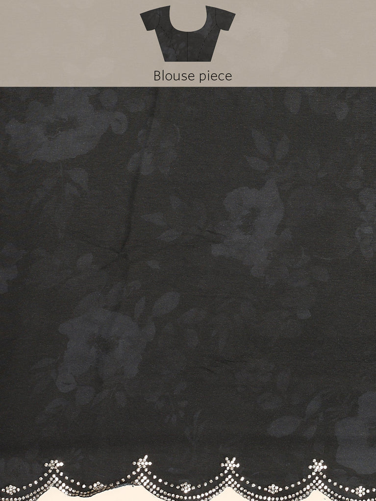 Elevate your elegance with this black stain floral printed saree, featuring intricate Swarovski embroidery that catches the light with every movement. The delicate floral design combined with sparkling details offers a refined and graceful look, perfect for special occasions. Crafted to enhance your sophistication, this saree blends traditional charm with modern glamour seamlessly.