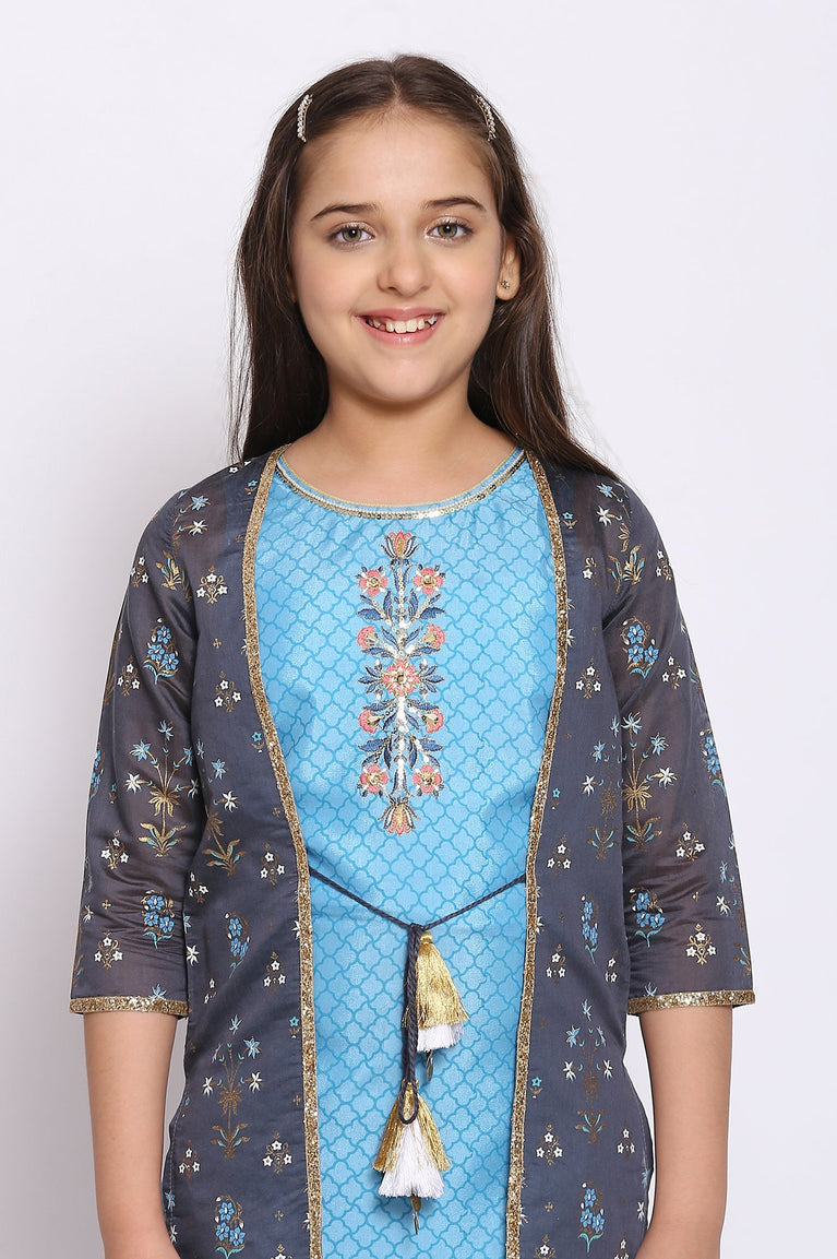 Blue Straight kurta-Trousers-Gillet Girls Set
