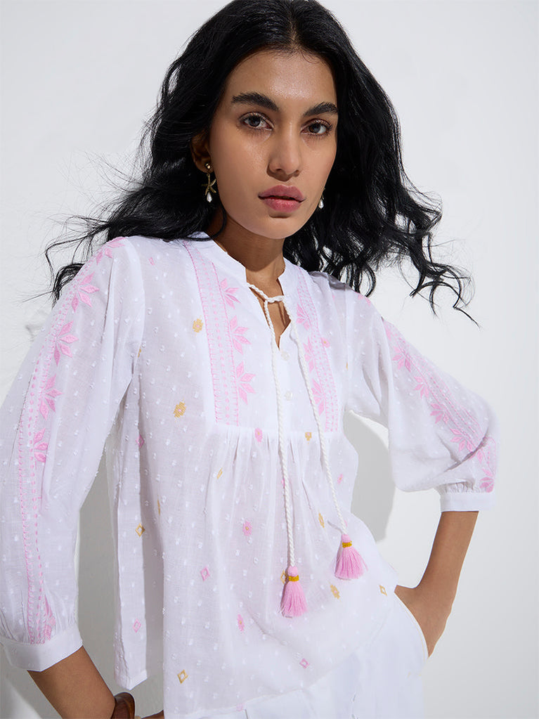 Bombay Paisley White Schiffli Detailed Cotton Top
