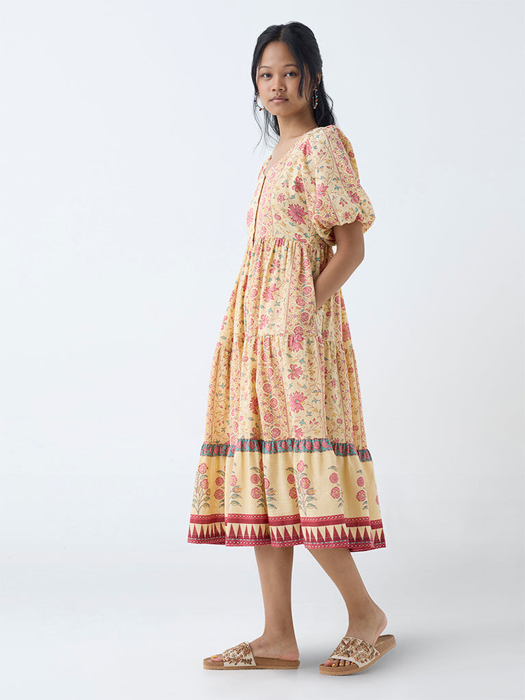 Bombay Paisley Yellow Floral Pattern Cotton Tiered Dress
