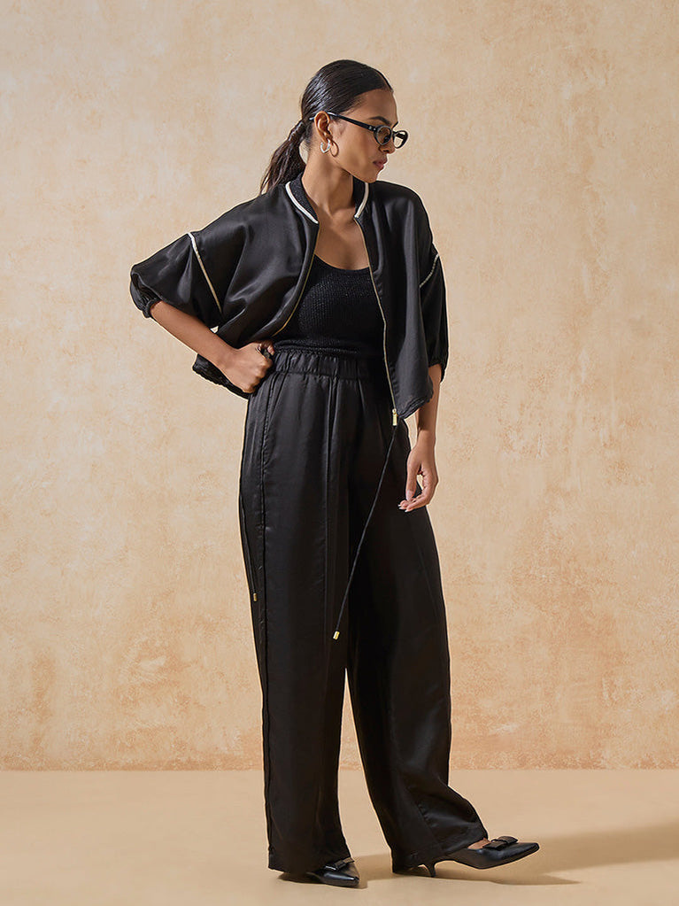 Give your layering edit a sporty-meets-sophisticated update with this black bomber jacket, crafted in a satin finish for a lustrous sheen. Detailed with a striped ribbed collar and gold zip fastening, it features voluminous three-quarter puff sleeves and gathered cuffs for a modern twist. White piping highlights the shoulders and sleeves, while the elasticated hem ensures a flattering fit.