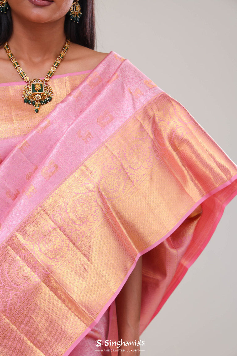 A luminous carnation pink kanjivaram silk saree where the body features delicate floral fauna jaal weaving in gold and tilfi zari, complemented by a broad border & pallu displaying classic diamond and floral patterns. Ideal for weddings and festive gatherings.