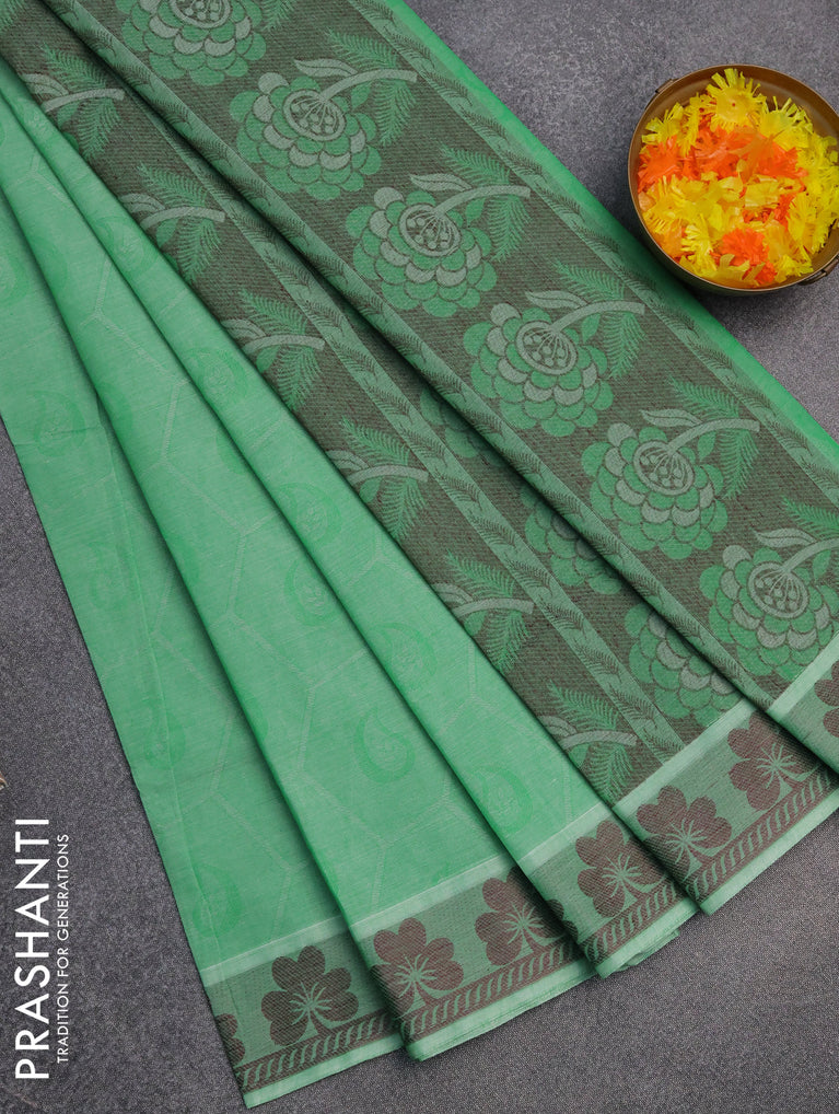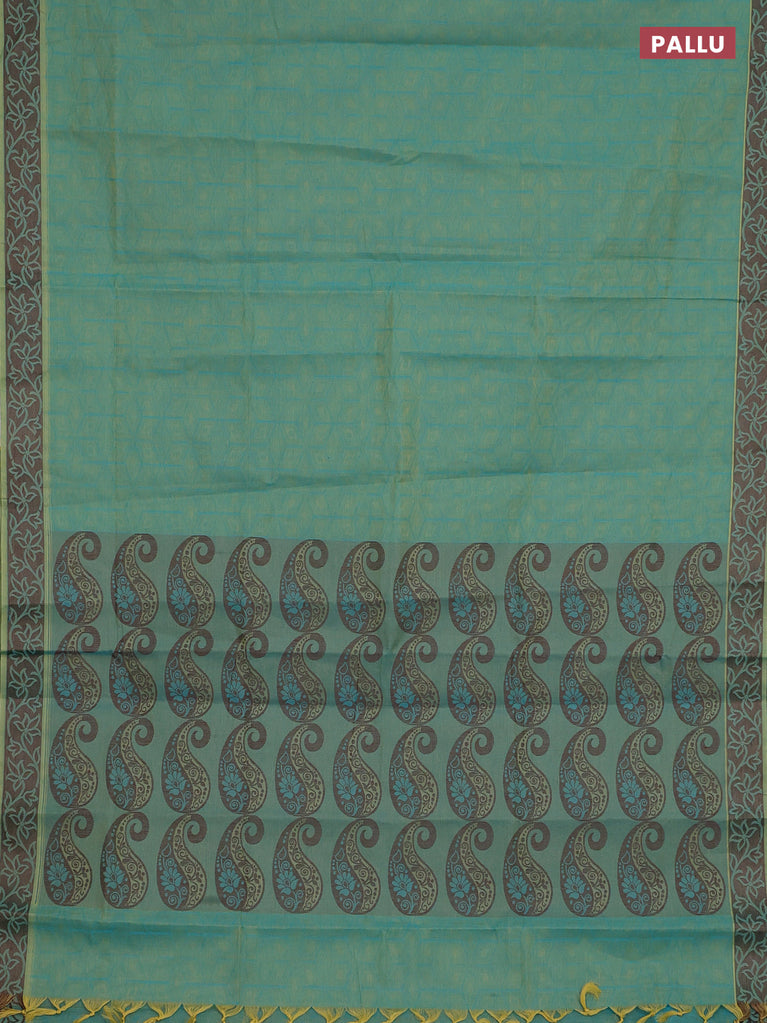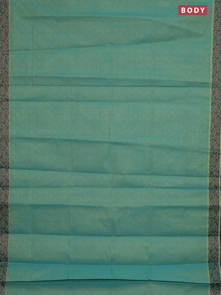 Coimbatore cotton saree dual shade of teal bluish green and coffee brown with allover self emboss and thread woven border