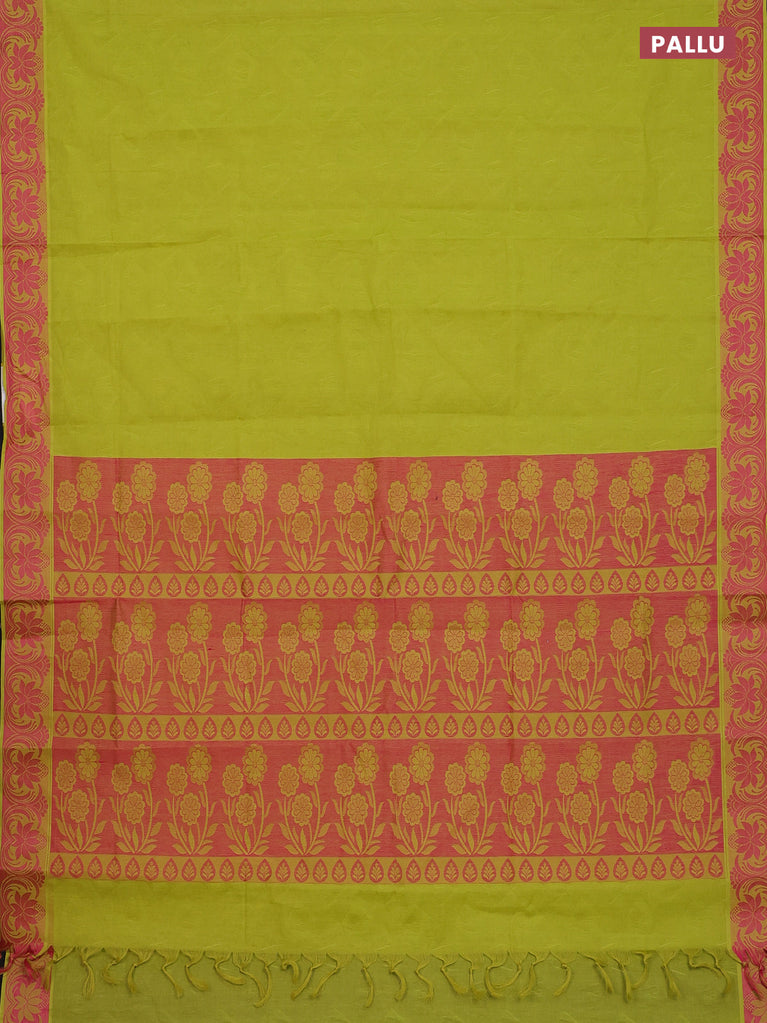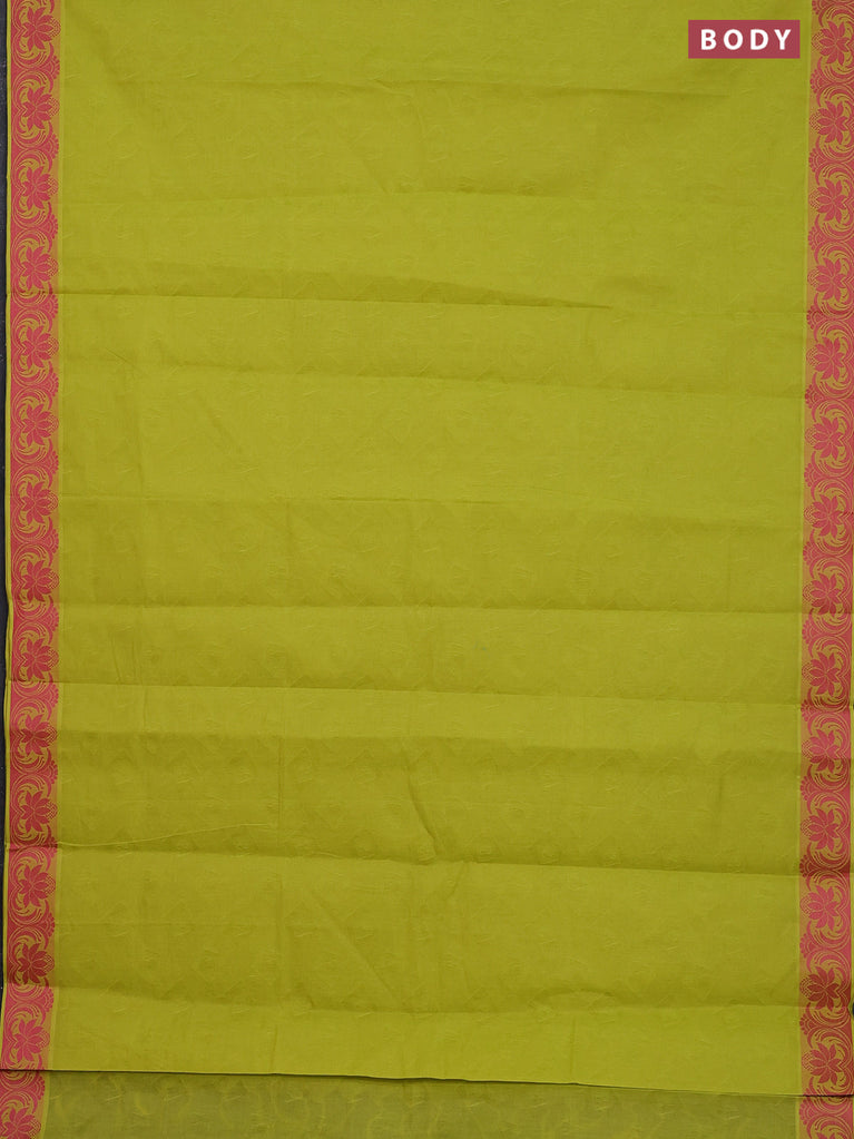 Coimbatore cotton saree fluorescent green and pink with allover self emboss and thread woven border