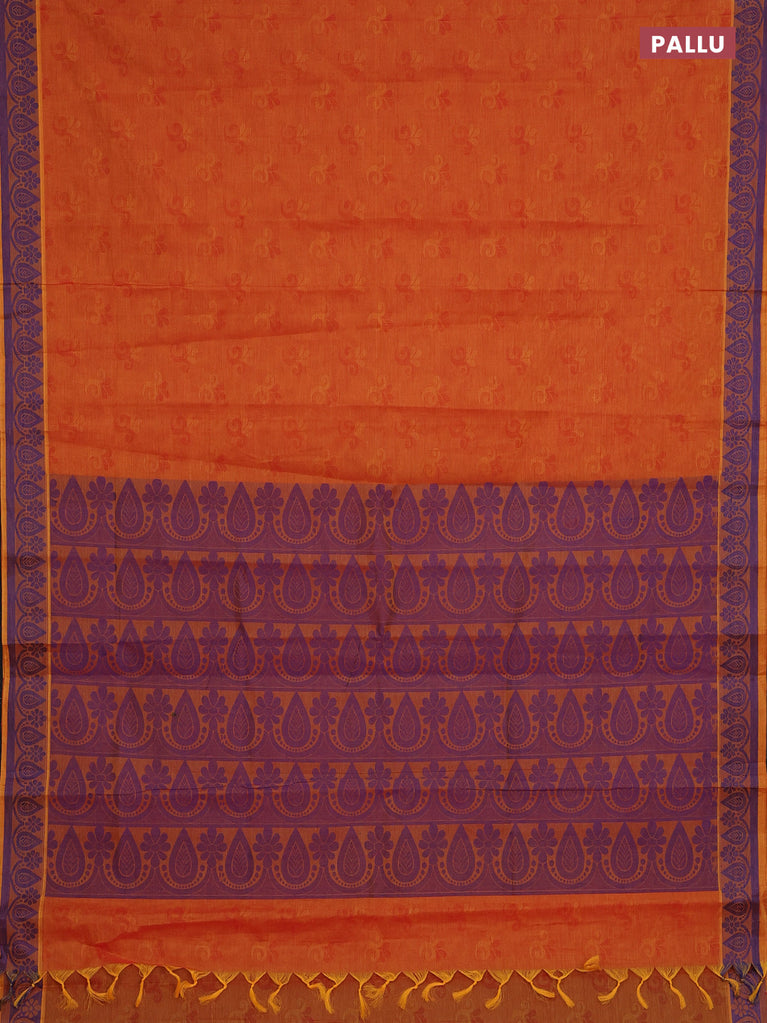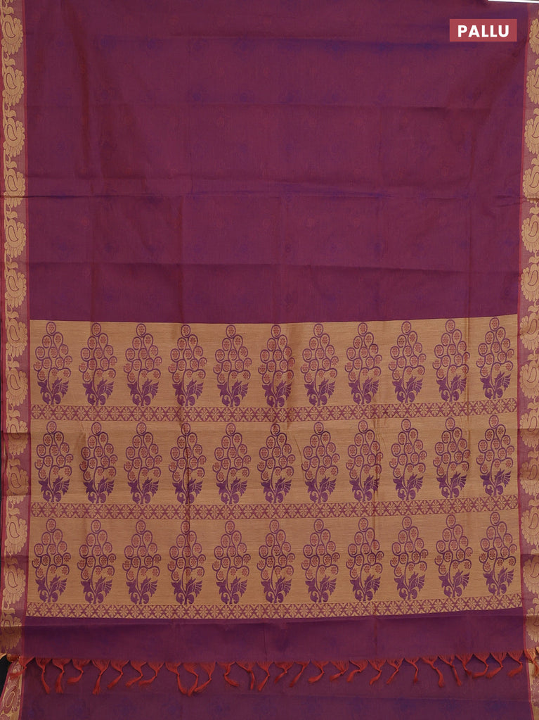 Coimbatore cotton saree dual shade of yellowish purple with allover self emboss and thread woven border