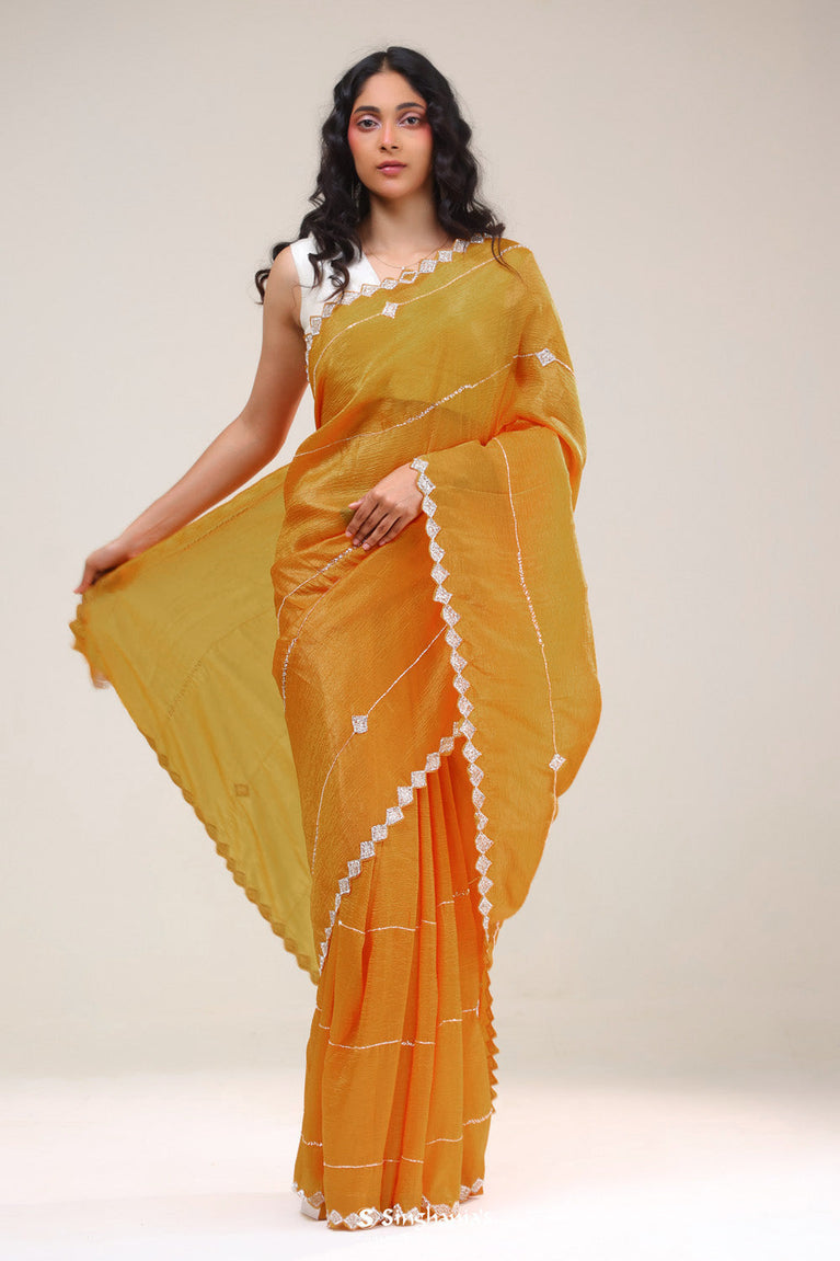 A saree that glows as beautifully as you do! This dahlia yellow saree is woven with tissue fabric, creating a soft, radiant shimmer. Accentuated with glass beads and stones, stripes embroidery, it’s an excellent choice for festivals, receptions and grand celebrations.