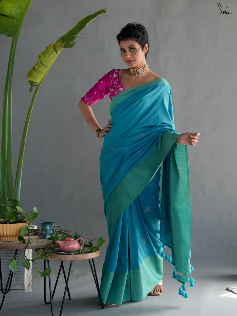 These sarees are handwoven with linen and zari, making them a truly luxurious and yet mindful addition to your wardrobe.