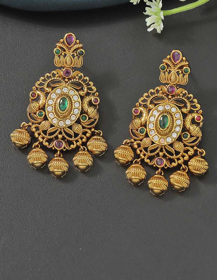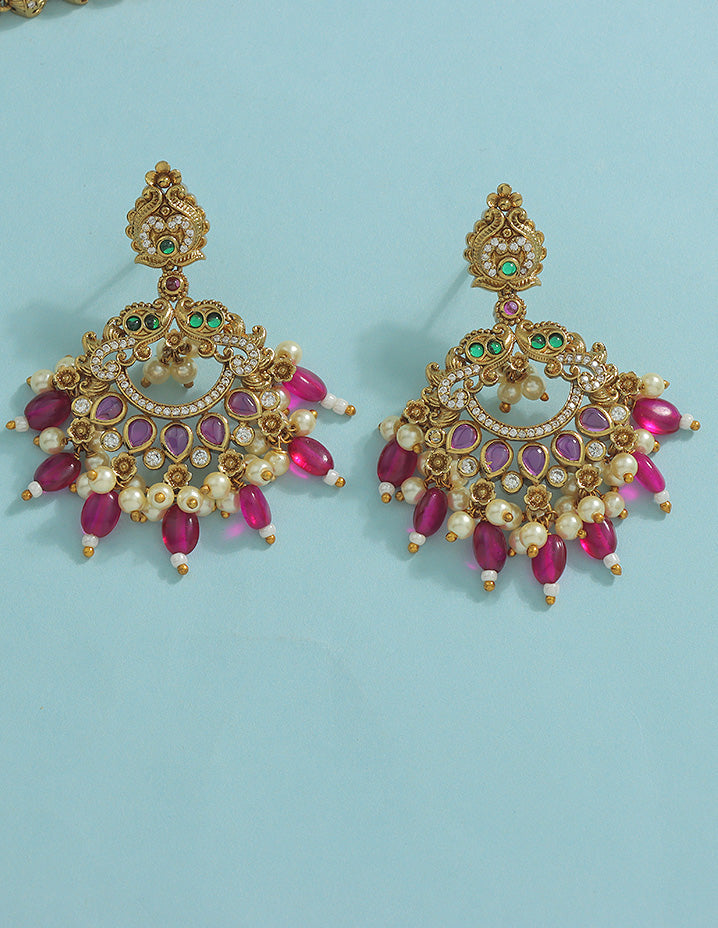 This beautiful aesthetic Zirconia necklace set right here is dripping in elegance and style. The traditional design of the necklace, studded in American diamond stones,Rubies and Emerald Stones beckons one to regal flair.
