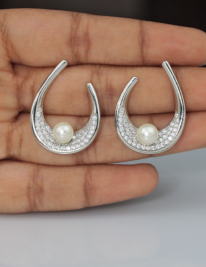 These elegant crescent-shaped earrings feature a stunning blend of tradition and glamour. Crafted in a lustrous Different finish, the design is encrusted with shimmering white stones that add a radiant sparkle. At the heart of each piece lies a luminous pearl, adding a classic and sophisticated touch. Perfect for both festive occasions and formal gatherings, these earrings beautifully combine modern design with timeless charm.