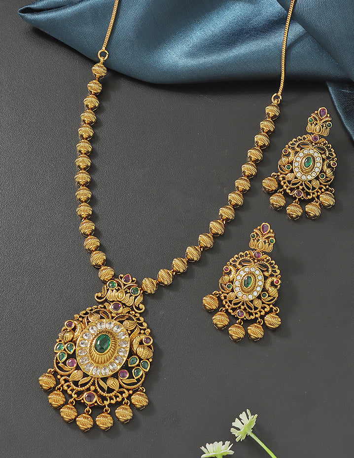 This Matt Polish Kempu Necklace Set, studded with dazzling ruby and emerald stones, radiates elegance and style. Its unique design is a visual treat, making it the perfect statement piece for any occasion.