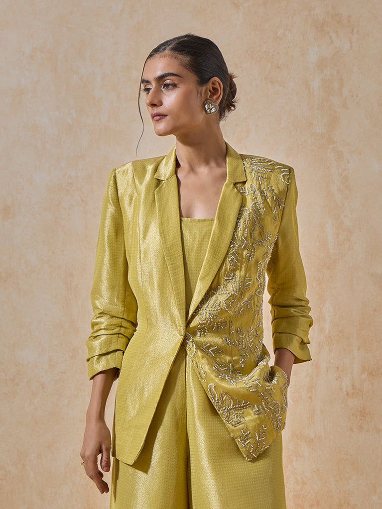 An ode to contemporary glamour, this lime blazer and inner set lights up the room with its metallic sheen and embellished detailing. The single-button blazer features a notched lapel collar, ruched sleeves, and asymmetric embellishment for a hint of drama. Style it with sleek trousers and heels for evenings that blend celebration with edge.