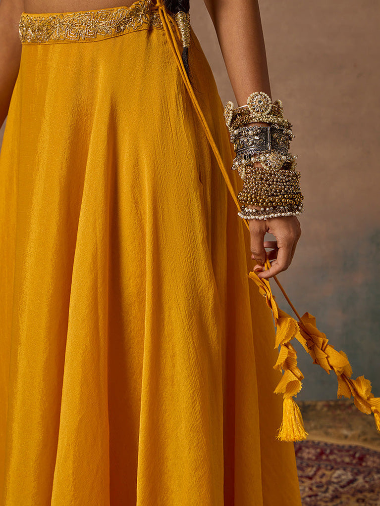 A festive skirt designed with soft structure and understated shine. Crafted in a luxurious fabric, it features a zari-embroidered waistband with tassel-tipped drawstrings that add charm and adjustability. The maxi silhouette falls gently with each step, and side pockets offer an unexpected, practical touch.