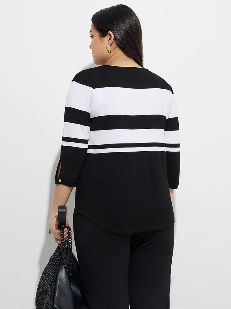Gia brings this black top crafted from a quality fabric for lasting comfort. It features a ribbed round neck and full sleeves, enhanced with subtle embellished detailing that lends a touch of elegance, a versatile pick for both casual and polished looks.
