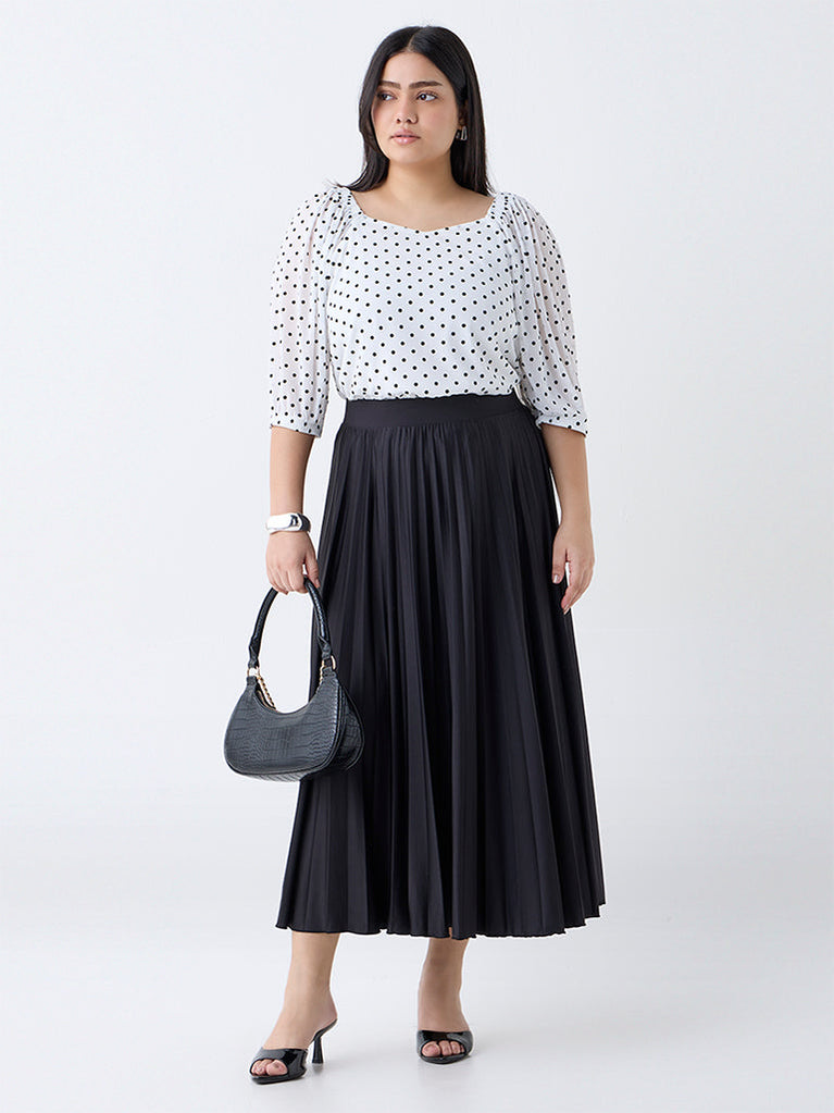 Make a stylish statement wearing this black top from Gia, fashioned in a trendy colour-blocked profile with contrasting accordion pleats at the back for a contemporary edge. Designed with a classic round neck and short sleeves, it is milled from a breathable fabric for all-day comfort.