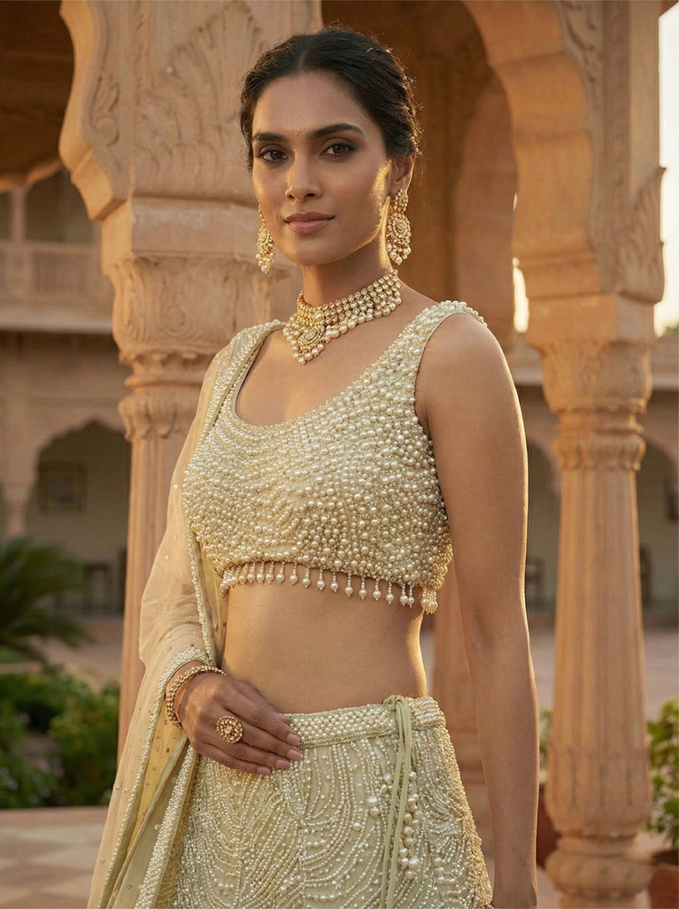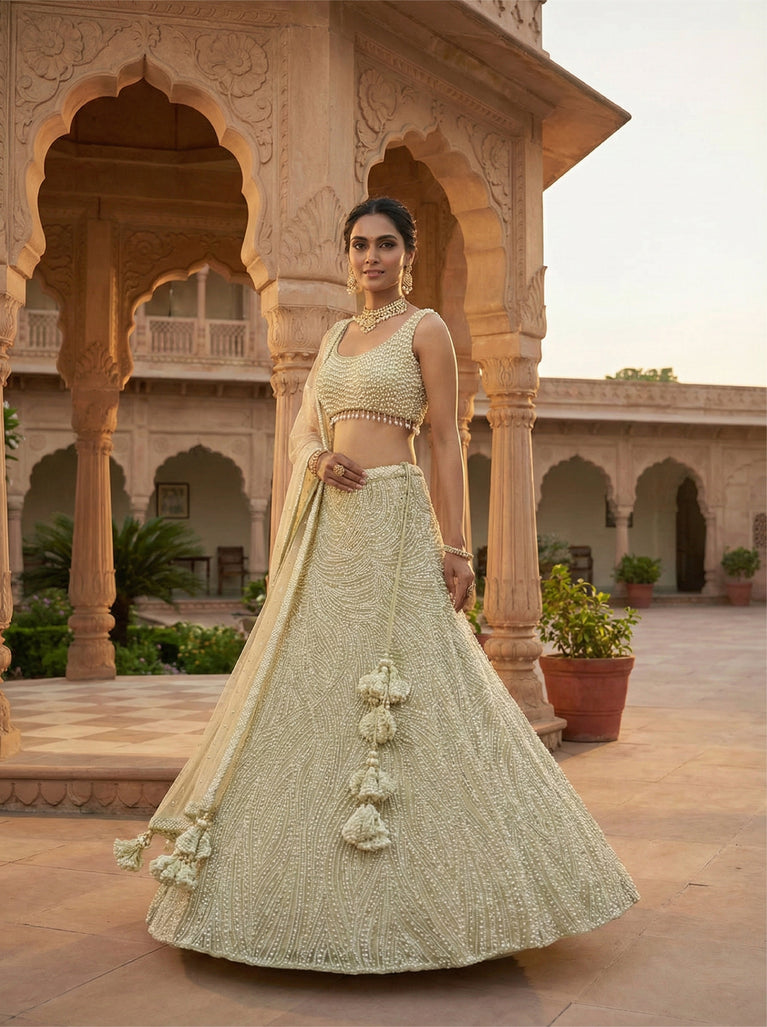 Elevate your festive wardrobe with this exquisite Ivory Net Heavy Pearl Embroidered Ghagra Set. Crafted from premium net fabric, this three-piece ensemble features intricate pearl embroidery work that catches light beautifully, making it ideal for weddings, celebrations, and special occasions. The voluminous ghagra silhouette offers graceful movement and comfort, while the coordinated choli and dupatta complete the traditional look with contemporary elegance. Perfect for those who appreciate refined craftsmanship and timeless ethnic style.