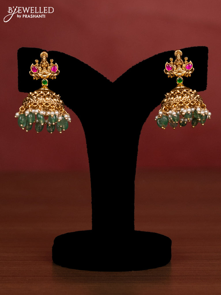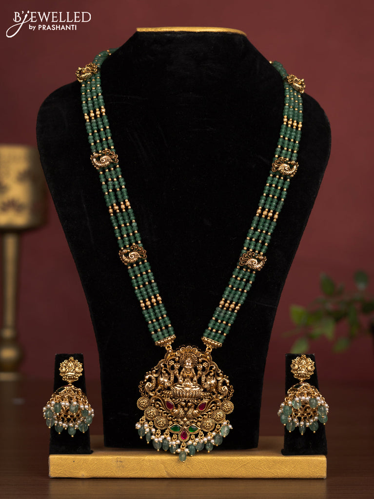 Jadau beaded haaram lakshmi pendant with jadau kemp stones and pearl & green beads hanging