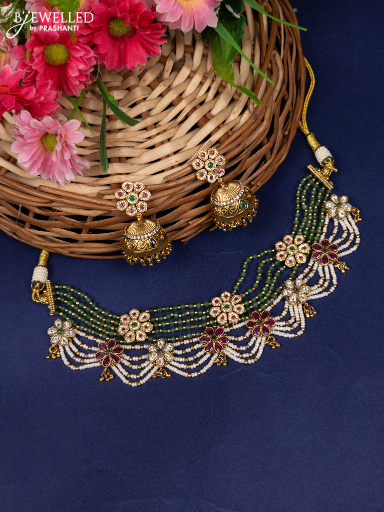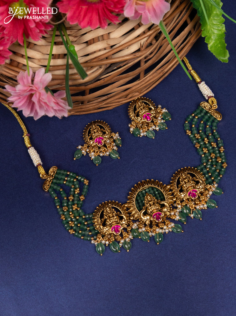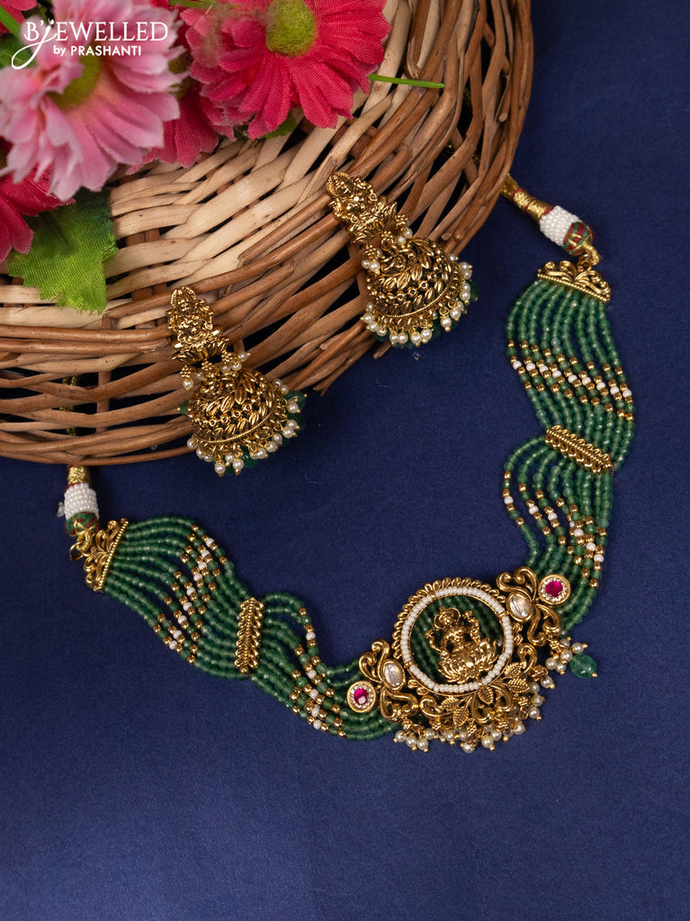Jadau beaded choker lakshmi pendant with jadau kundan stones and pearl & green beads hanging