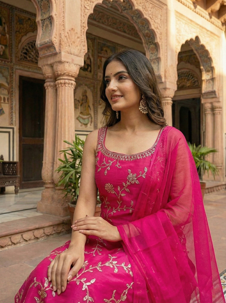 Elevate your ethnic wardrobe with this striking magenta silk Anarkali set, a timeless piece that seamlessly blends traditional craftsmanship with contemporary elegance. Crafted from premium silk fabric, this ensemble features intricate embroidery work that showcases meticulous artistry and attention to detail. The rich magenta hue commands attention and pairs beautifully with traditional jewelry and accessories. Perfect for those who appreciate authentic Indian fashion with refined sophistication.