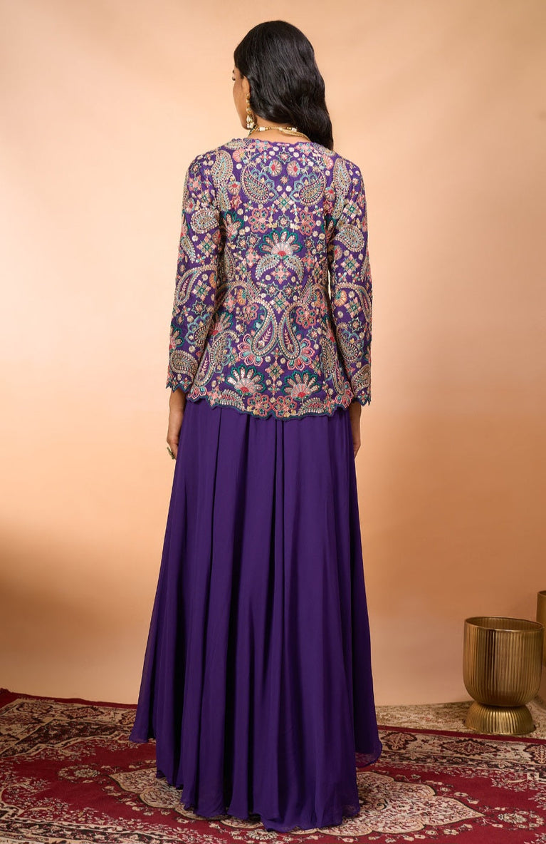 Purple Indo-Western Ensemble with Mrunal Rao Pattern & Multicolor Thread Work | Chinnon Fabric Plazo
