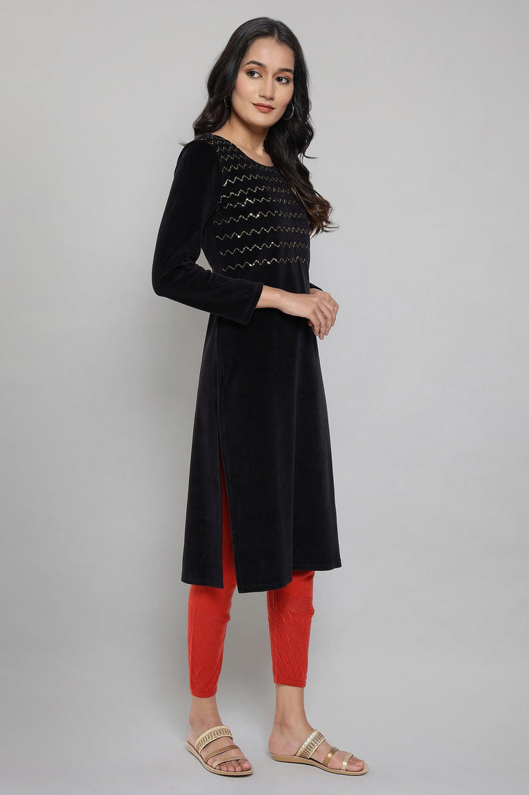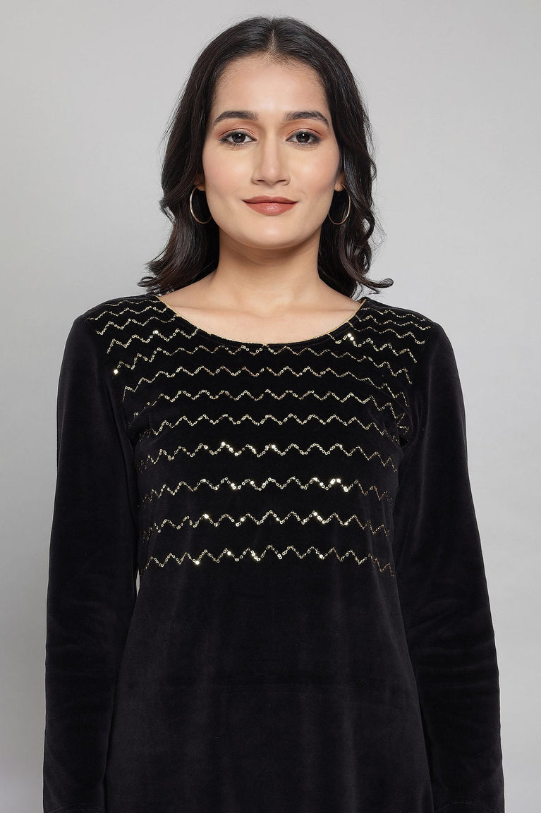 Black coloured round solid straight kurta having zari embroidery, sequin embellishment, round neck and three-quarter sleeves. To complement, the set contains matching palazzos with elasticated waistband and a contrasting golden coloured dupatta.