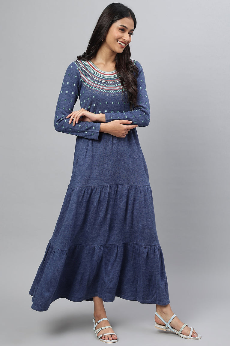 Feminine and chic, this tiered dress features a printed yoke and solid tiers. The yoke has an elaborate geometric neck design that is complimented by subtle all over geometric design. You can adjust the fit by using doris that have a tassel detail at the edges.