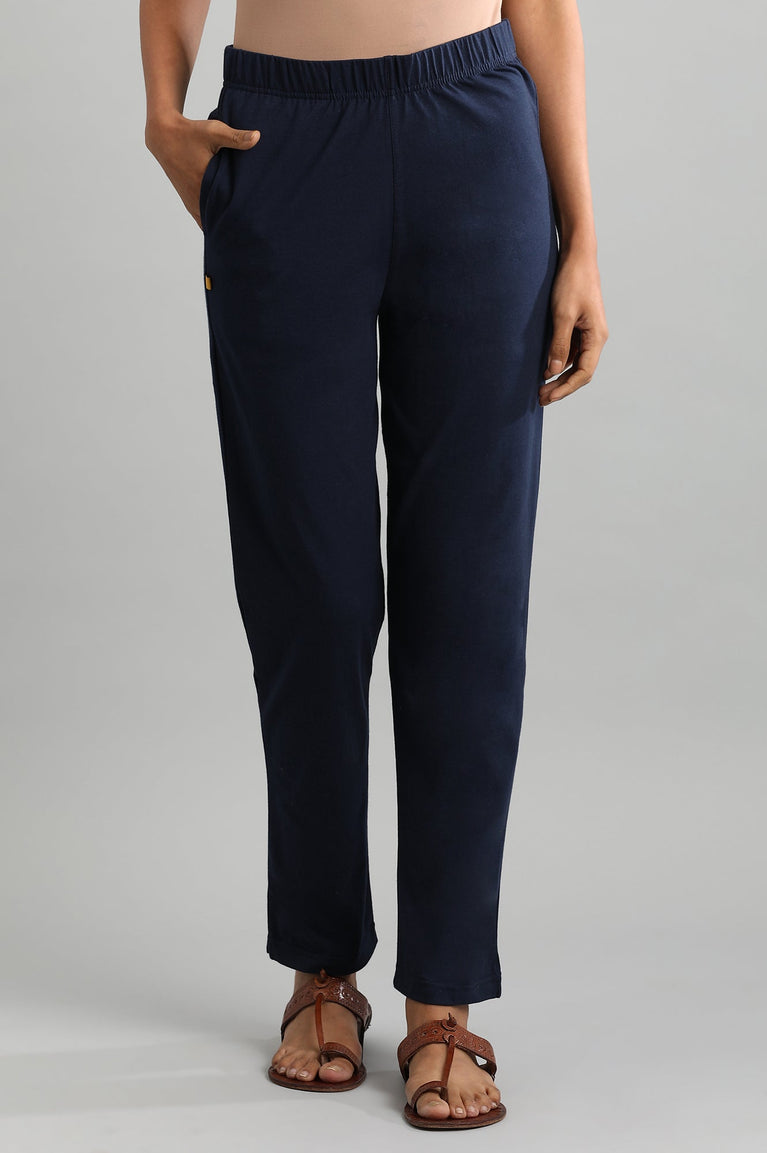 Blue solid straight fit palazzos with elasticated back, striped detail and tie-up detail.