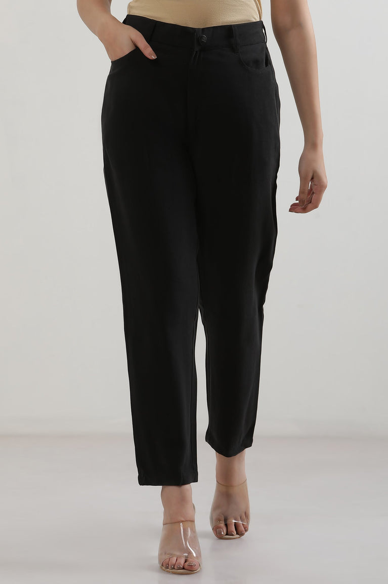 Black Solid Straight Fit Rayon Pants With Button Closure