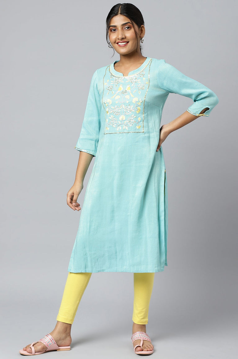 Blue round neck 3/4 sleeve kurta with embellished yoke detail.