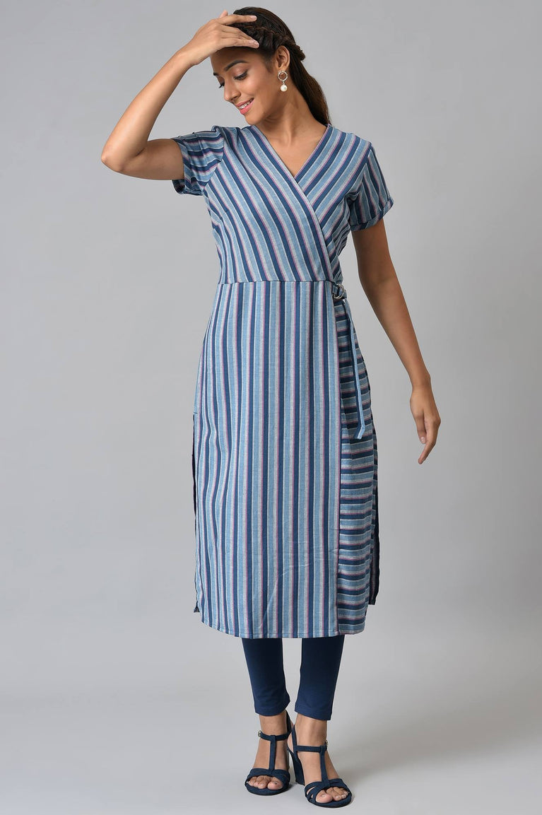 Inspired by the tranditional angrakha kurta, this piece is our contemporary take on the same. It features an interesting play of stripes with a metallic buckle that can be used to adjust and alter the fit of the garment.