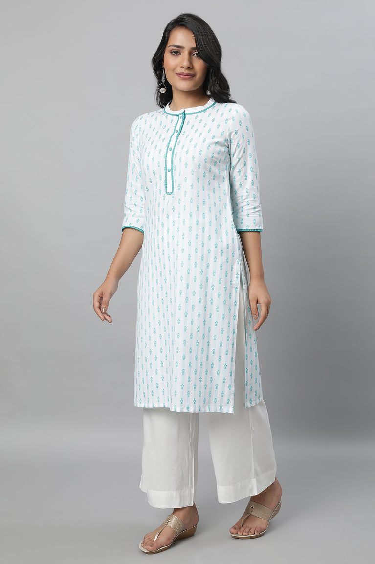 This blue round neck 3/4 sleeve kurta has printed detail and side slits.
