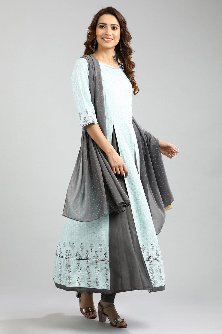 Pagoda blue printed kurta in round neck and three-quarter sleeves.